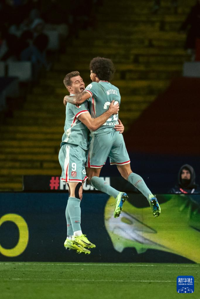 12月21日,马德里竞技队球员瑟洛特(左)与队友维特塞尔在比赛中庆祝进球。