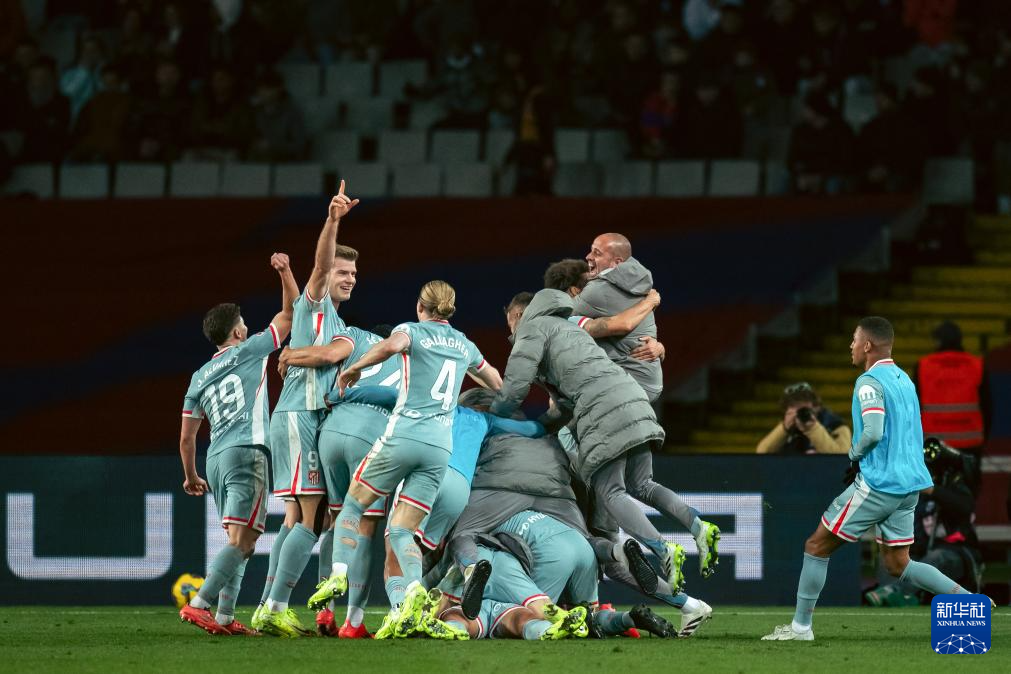 12月21日,马德里竞技队球员瑟洛特(左二)与队友在比赛中庆祝进球。
