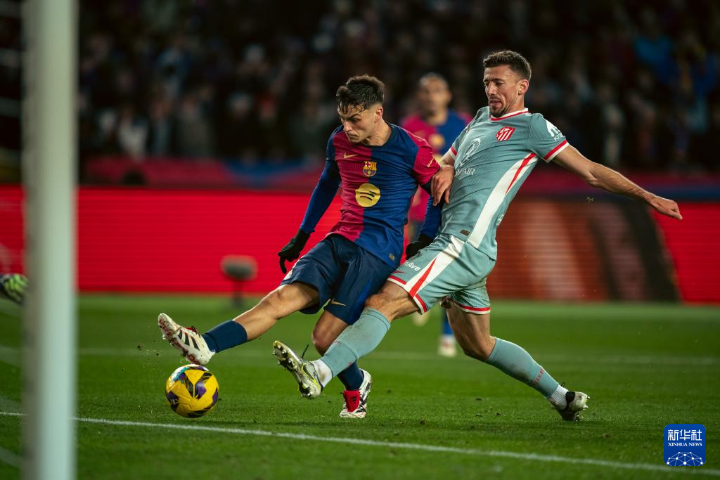 12月21日,巴塞罗那队球员佩德里(左)与马德里竞技队球员朗格莱在比赛中拼抢。