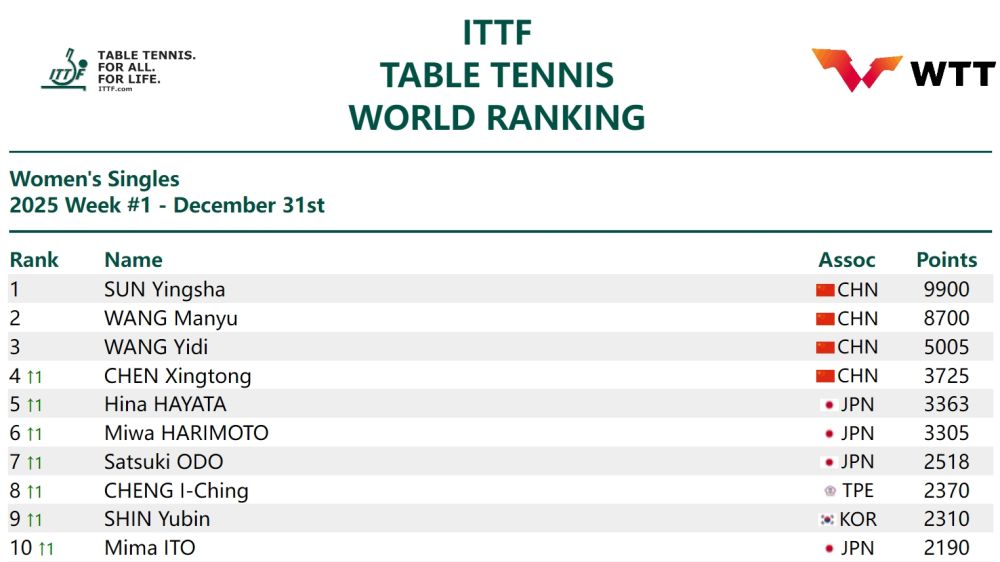 三名中国队运动员王曼昱、王艺迪和陈幸同位居女单第二至第四。排名世界前十的女单选手还有早田希娜(日本)、张本美和(日本)、大藤沙月(日本)、郑怡静(中国台北)、申裕斌(韩国)、伊藤美诚(日本)。
