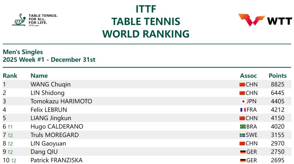 王楚钦、孙颖莎继续位居男单和女单世界第一。男单方面,国乒小将林诗栋和日本选手张本智和分列第二和第三。排名第四至第十的选手为费利克斯·勒布伦(法国)、梁靖崑(中国)、卡尔德拉诺(巴西)、莫雷高德(瑞典)、林高远(中国)、邱党(德国)、弗朗西斯卡(德国)。