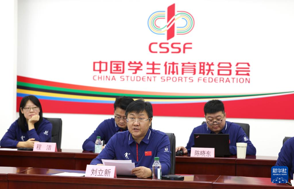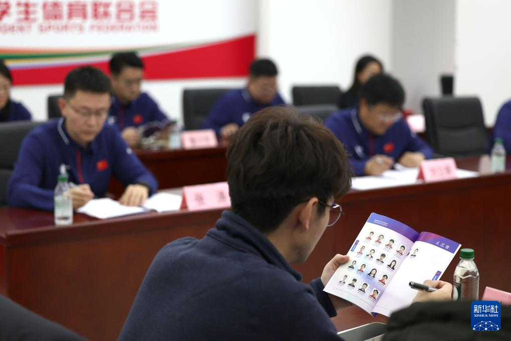 1月7日,教育部学生体育协会联合秘书处秘书长、中国代表团团长刘立新(前)在会上发言。新华社记者 丁旭 摄