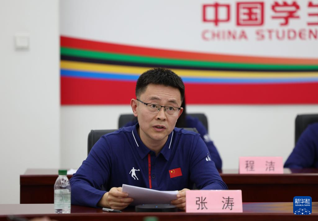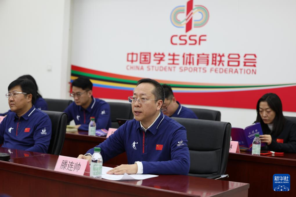 1月7日,教育部学生体育协会联合秘书处副秘书长、中国代表团副团长滕连帅(前)介绍中国代表团组团情况。新华社记者 丁旭 摄