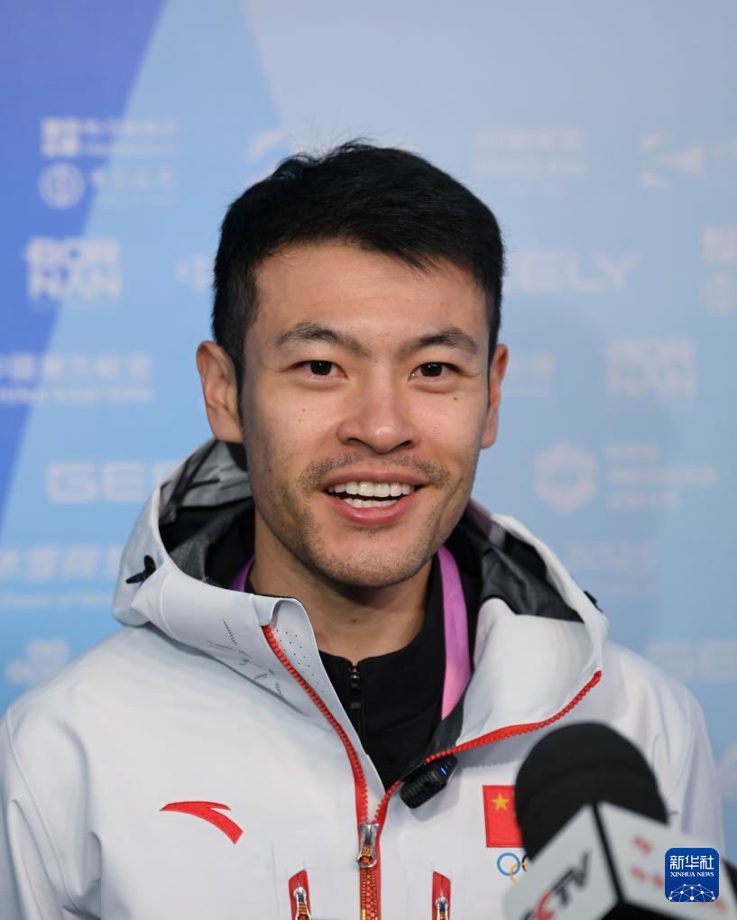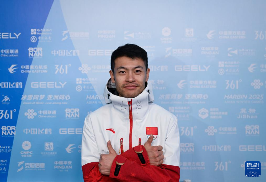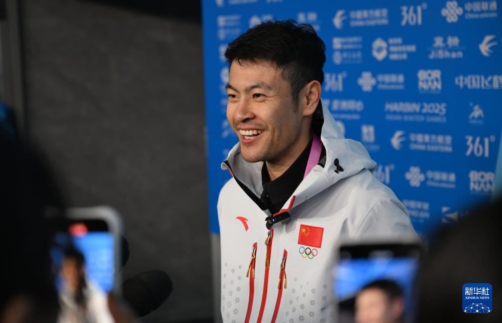 当日,哈尔滨亚冬会开幕式中国体育代表团旗手宁忠岩在黑龙江省冰上训练中心速滑馆接受集体采访。