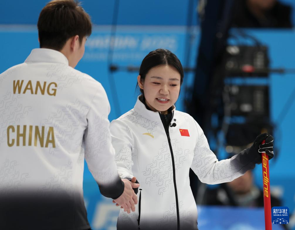 2月8日,中国队选手韩雨(右)/王智宇在比赛中击掌。