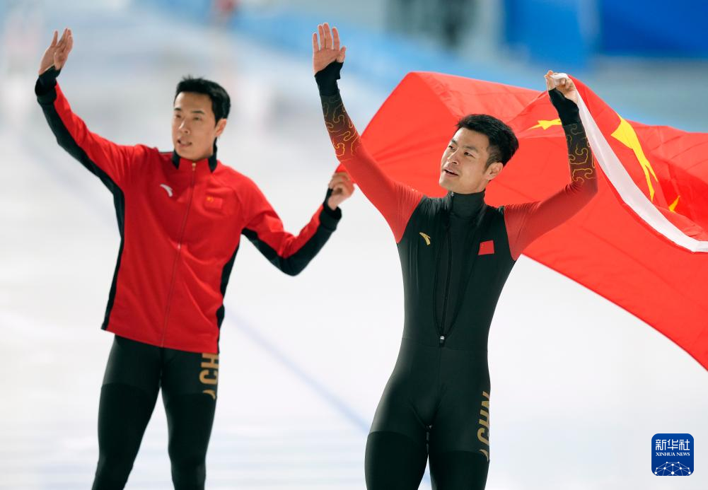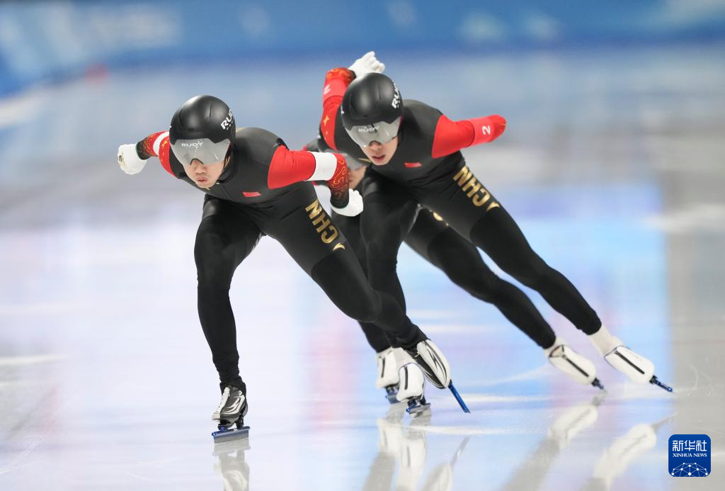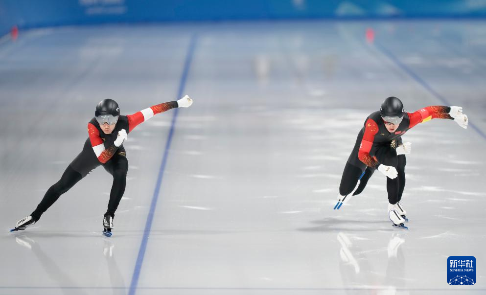 2月10日,中国队选手高亭宇(左)与队友廉子文在比赛中。