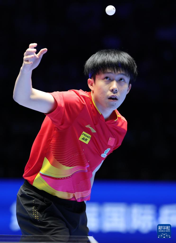 2月23日,王楚钦在比赛中发球。