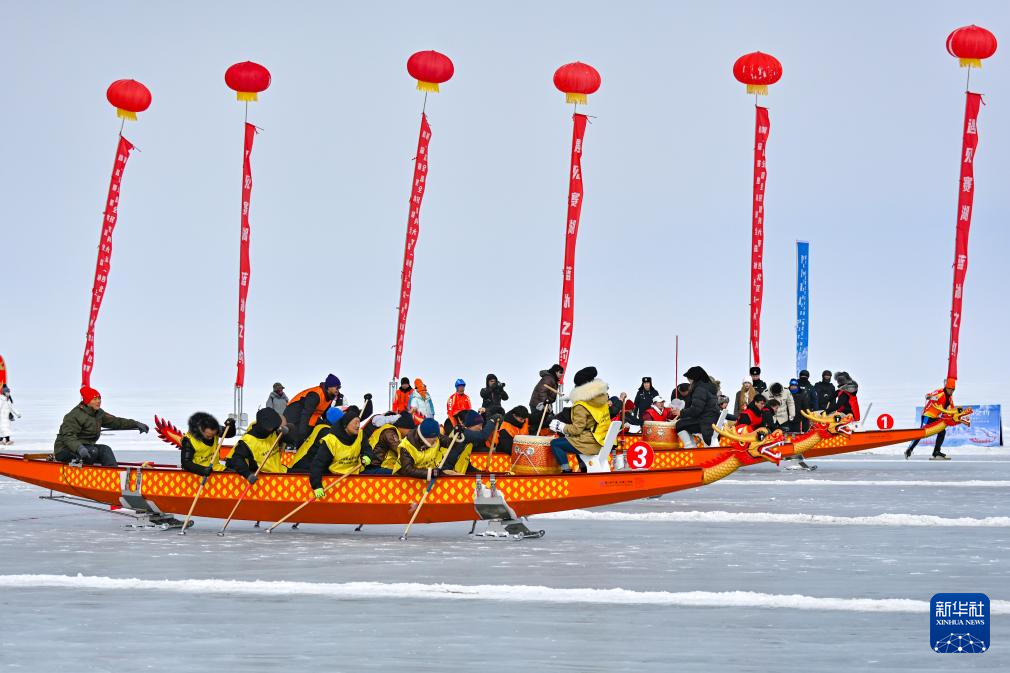 3月15日,参赛选手在冰上龙舟比赛中(无人机照片)。