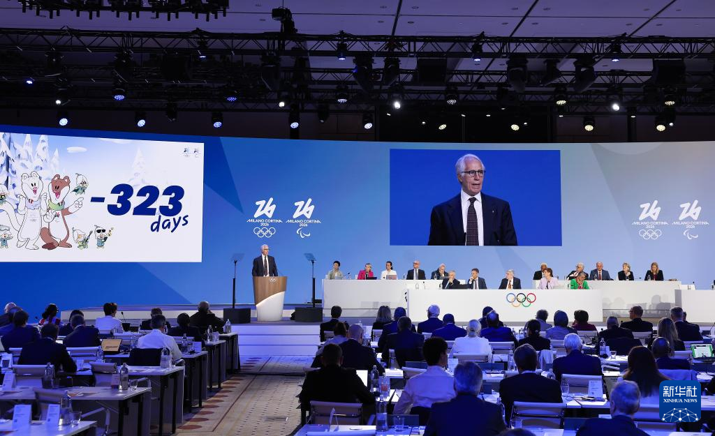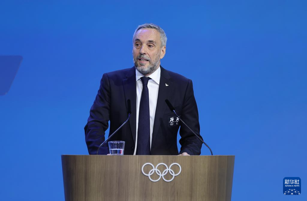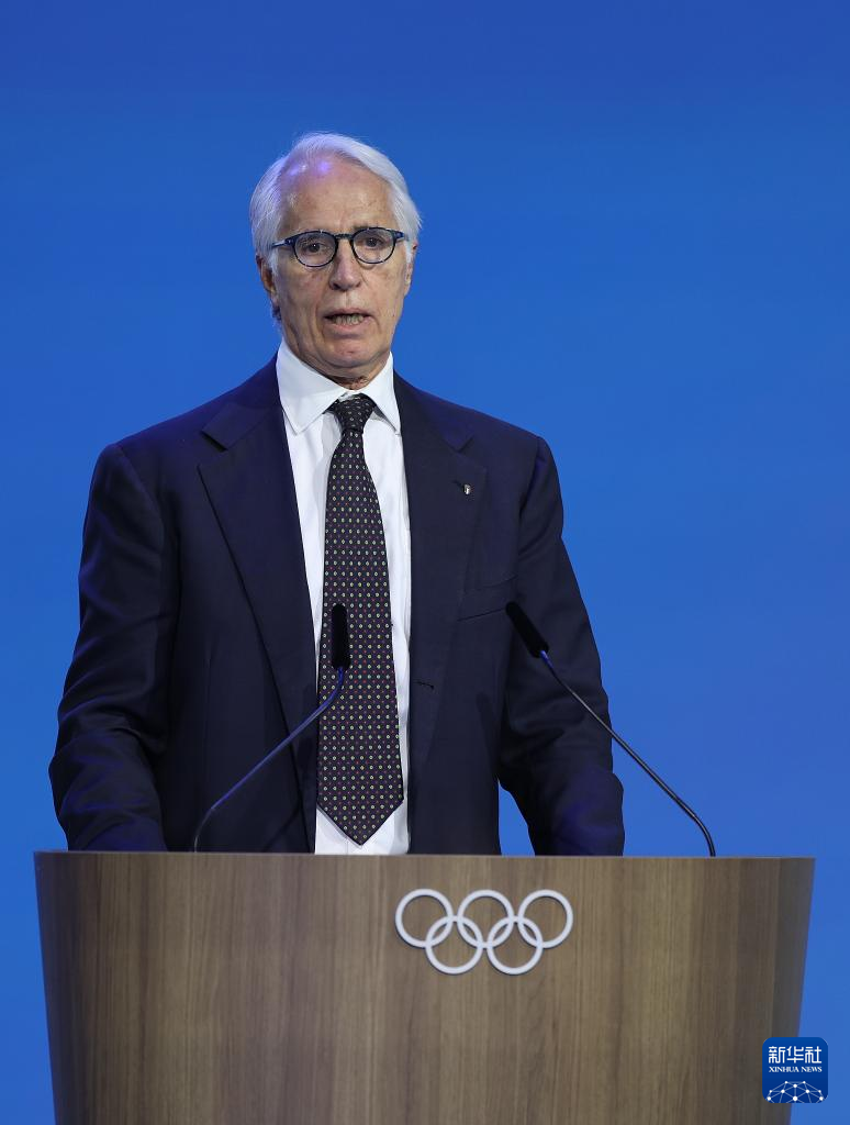 3月20日,意大利奥委会主席、米兰-科尔蒂纳丹佩佐冬奥会组委会主席乔瓦尼·马拉戈就2026年米兰-科尔蒂纳丹佩佐冬奥会筹备议题发言。