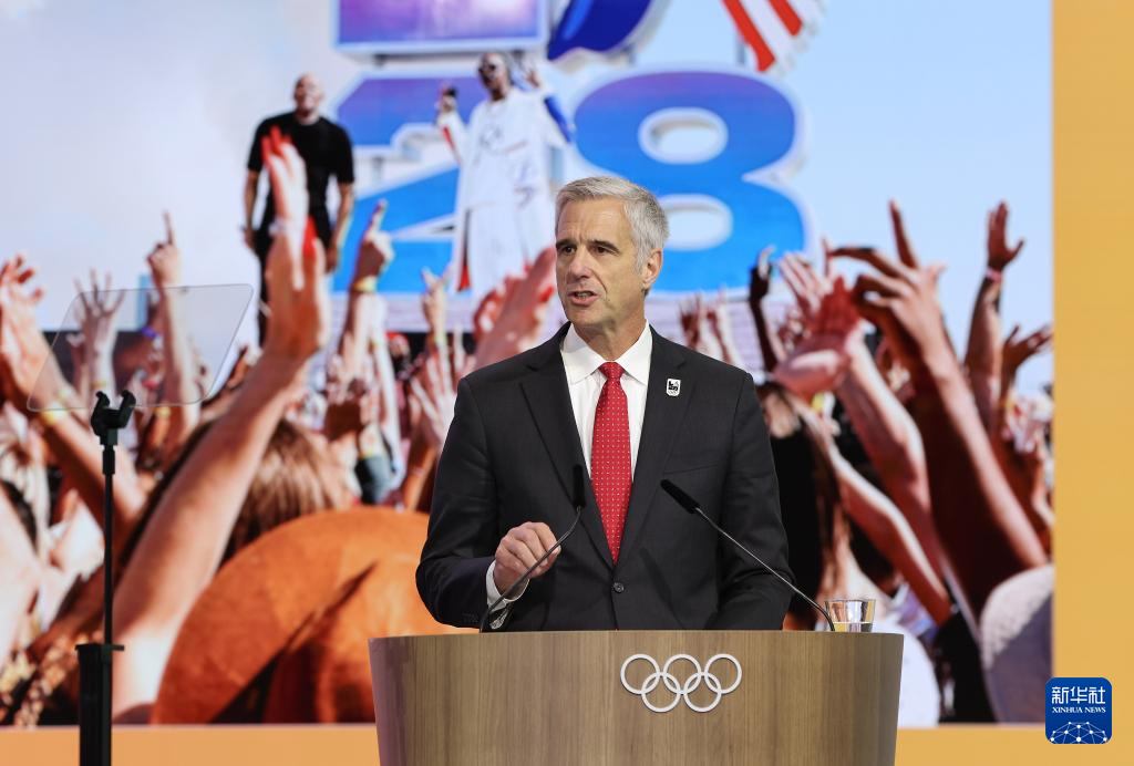 3月20日,美国奥委会主席赛克斯就2028年洛杉矶奥运会筹备议题发言。