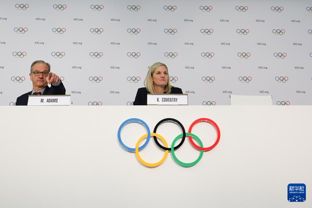 3月20日,国际奥委会新当选主席考文垂(上右)在发布会上。