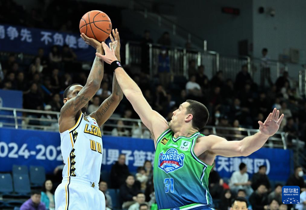 3月20日,天津先行者队球员詹姆斯(右)在比赛中防守浙江方兴渡队球员纳纳利。