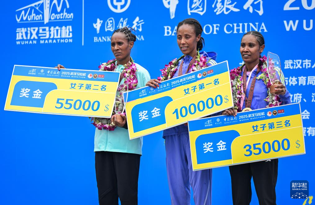 3月23日,马拉松女子组冠军埃塞俄比亚选手古特尼·肖恩·伊马纳(中)、亚军肯尼亚选手阿谢特·贝克雷·狄多(左)和季军埃塞俄比亚选手希沃特·加布雷基丹·格布雷马里亚姆在颁奖仪式上。