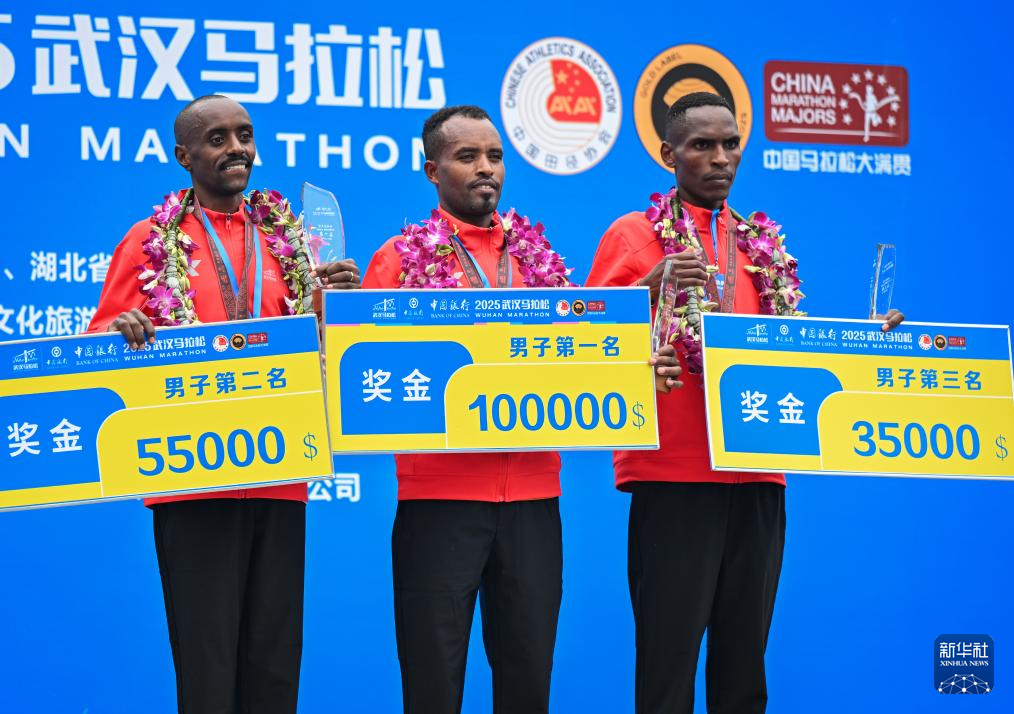 3月23日,马拉松男子组冠军埃塞俄比亚选手阿塞法·门格斯图·内格沃(中)、亚军肯尼亚选手约翰·姆布鲁·姆伊鲁利(左)和季军肯尼亚选手迈克尔·基马尼·卡马乌在颁奖仪式上。