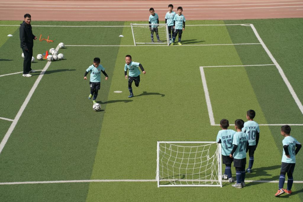 3月21日,在西安市曲江第六小学,足球队员在体育课上进行攻防练习。新华社记者 邵瑞 摄