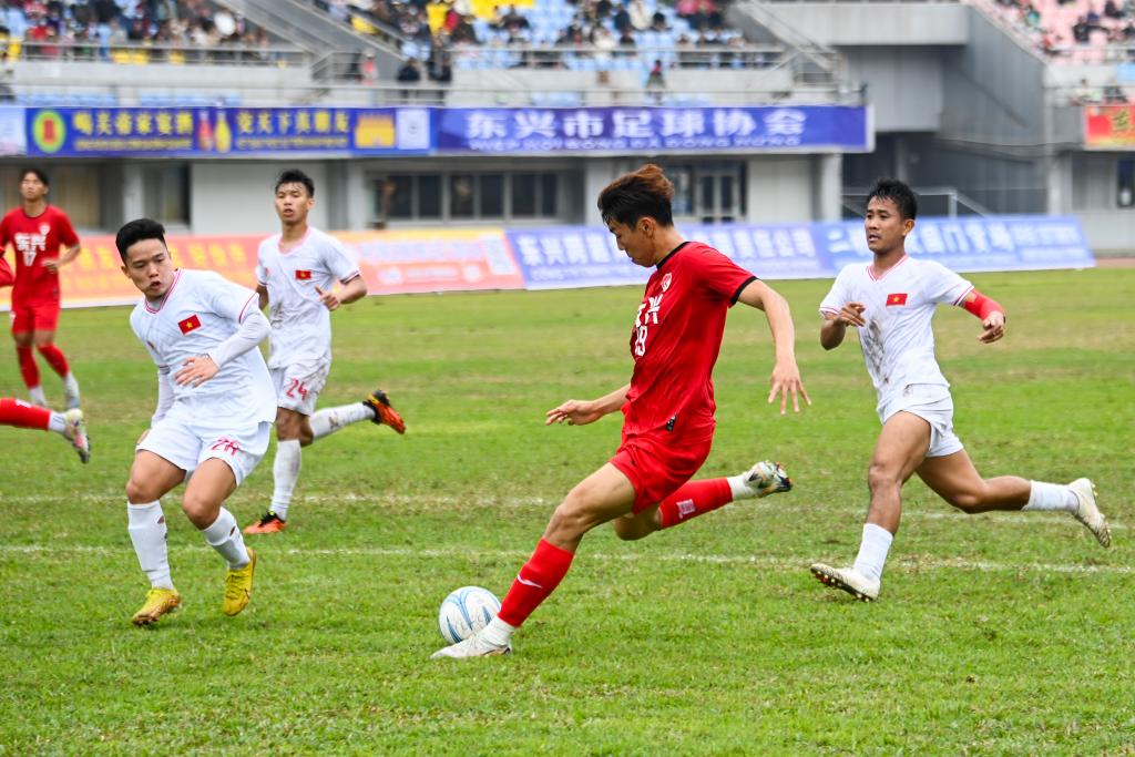 2月12日,中国东兴队球员郑钧蔚(右二)在第30届中国东兴-越南芒街元宵节足球友谊赛中射门。新华社记者 曹祎铭 摄