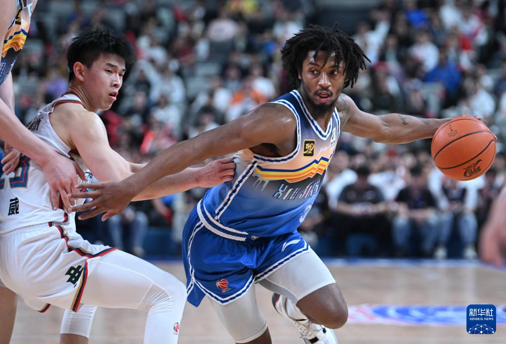 4月4日,新疆伊力特队球员黑根斯(右)在比赛中突破南京头排苏酒队球员林葳的防守。
