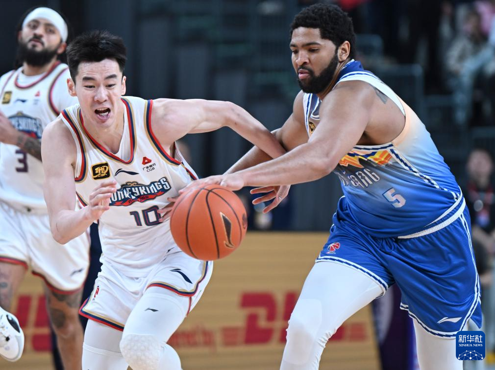 4月4日,新疆伊力特队球员劳森(右)与南京头排苏酒队球员郭昊文在比赛中拼抢。