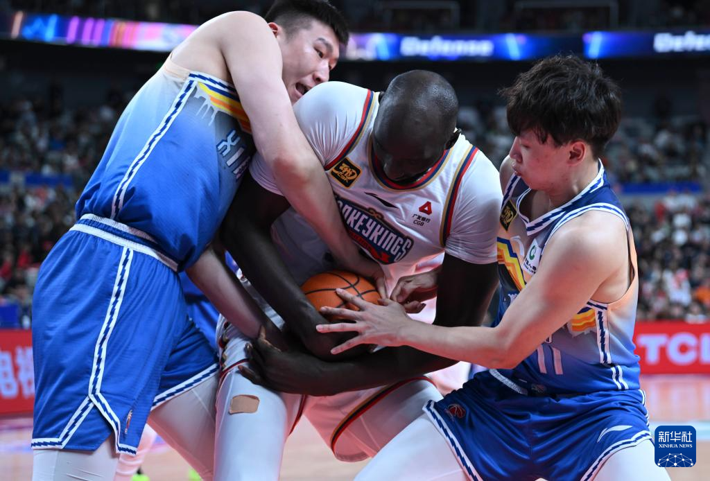 4月4日,南京头排苏酒队球员法尔(中)与新疆伊力特队球员齐麟(右)、李炎哲在比赛中拼抢。