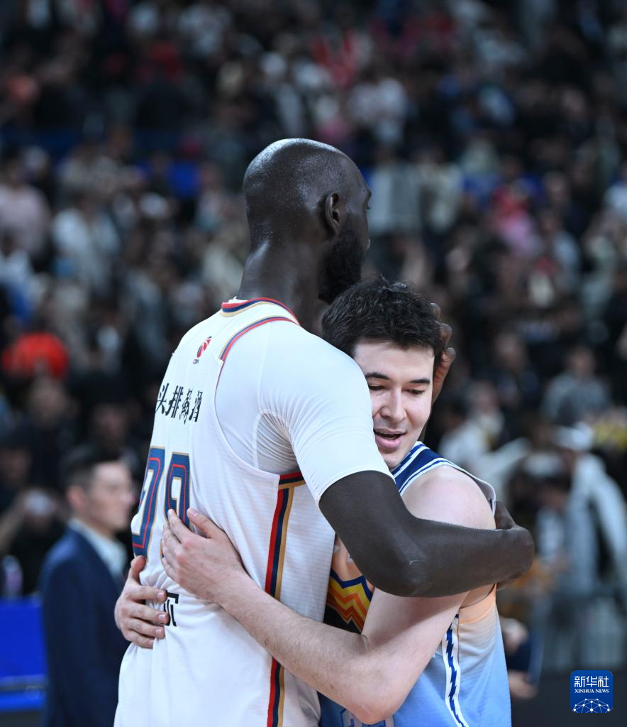 4月4日,新疆伊力特队球员阿不都沙拉木(右)在赛后与南京头排苏酒队球员法尔相拥致意。