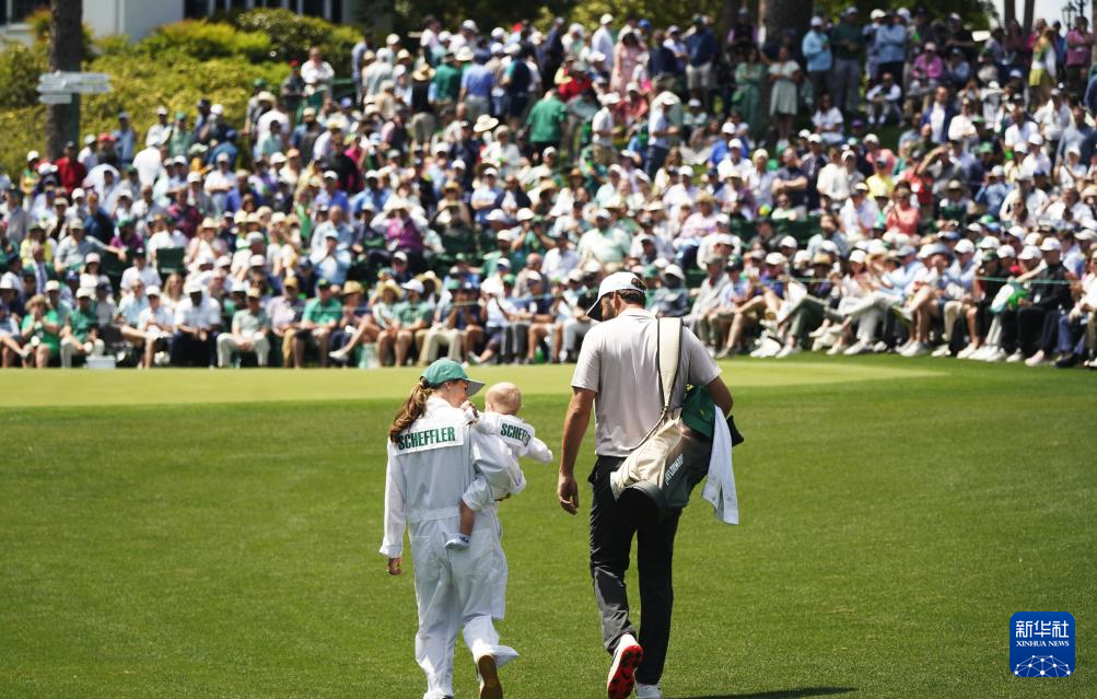 4月9日,上届冠军、美国选手斯科蒂·舍夫勒(右)与家人一起参加比赛。