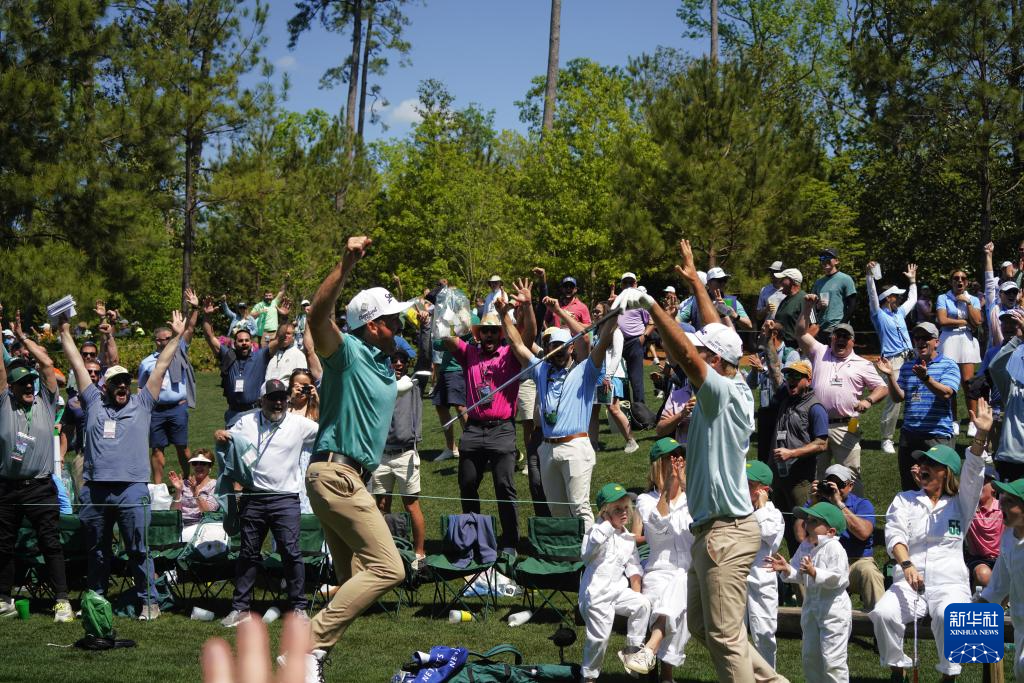 4月9日,上届冠军、美国选手斯科蒂·舍夫勒(前右)在比赛中开球。