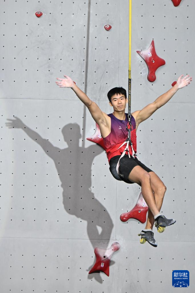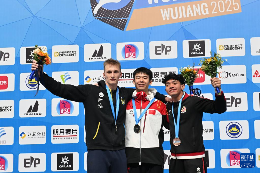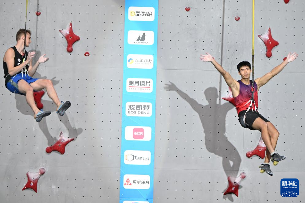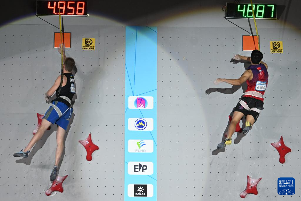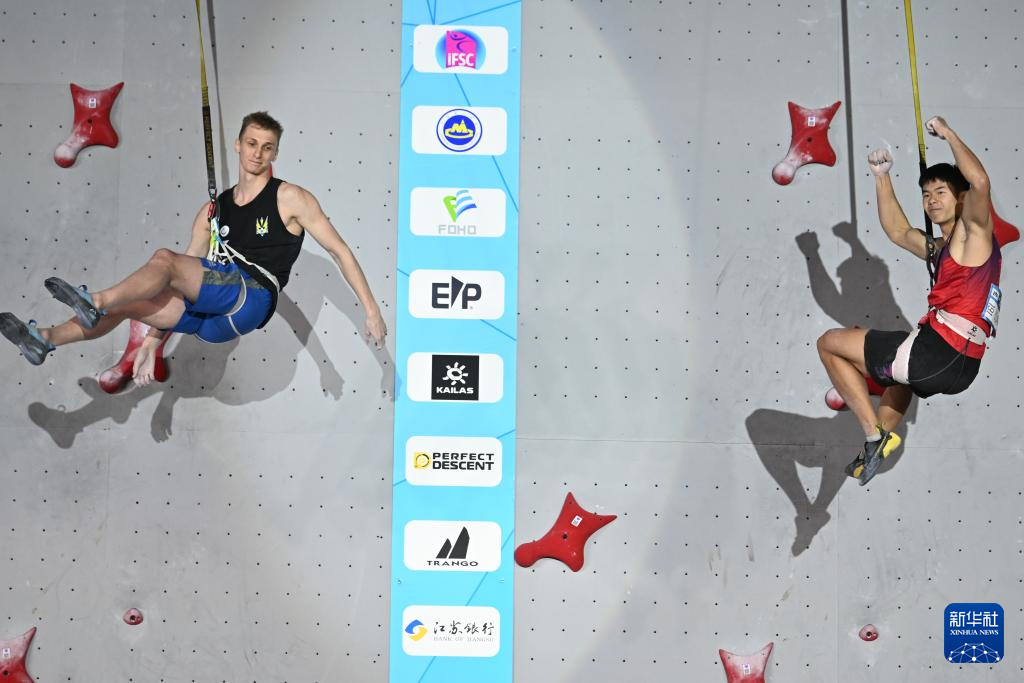 当日,在2025年国际攀联攀岩世界杯(吴江站)男子速度赛决赛中,中国选手龙见国战胜乌克兰选手伊尔奇申,获得冠军。