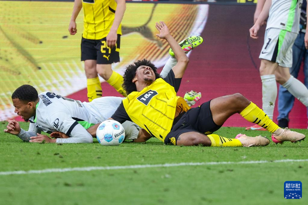 5月3日,多特蒙德队球员阿德耶米(右)与沃尔夫斯堡队球员弗兰克斯拼抢时摔倒。