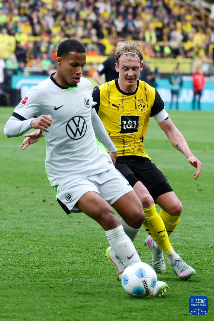 5月3日,多特蒙德队球员布兰特(右)与沃尔夫斯堡队球员弗兰克斯在比赛中拼抢。