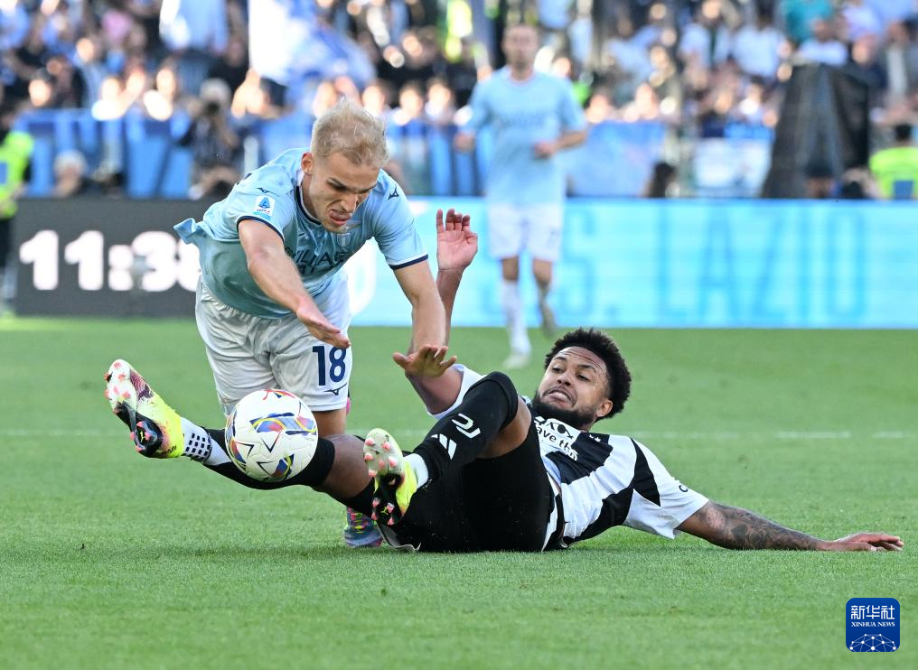 5月10日,拉齐奥队球员伊萨克森(左)与尤文图斯队球员麦肯尼在比赛中拼抢。