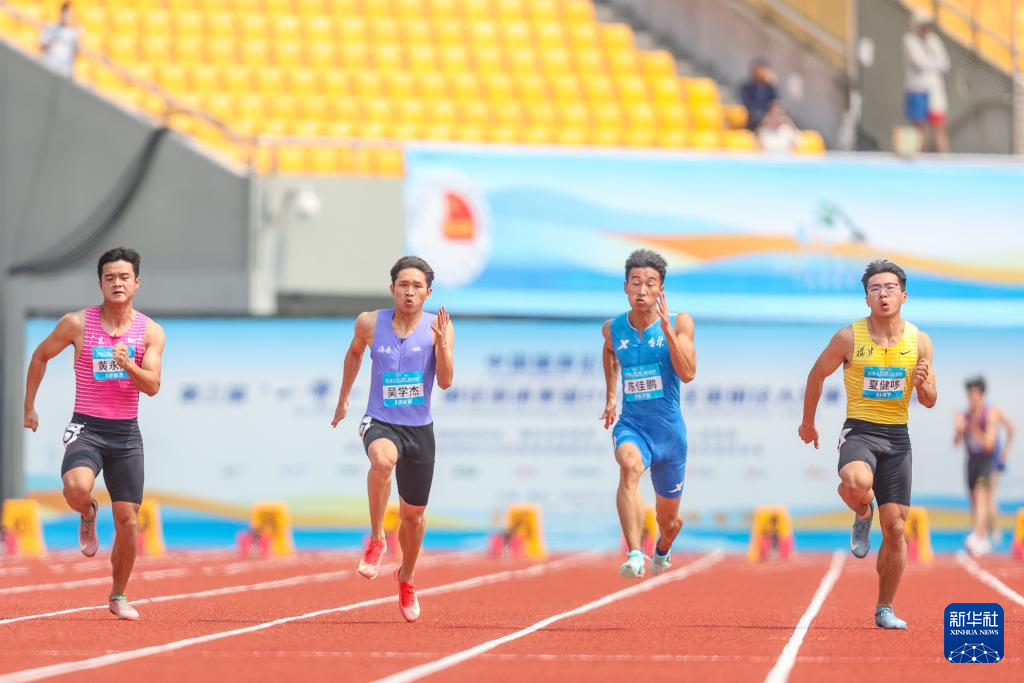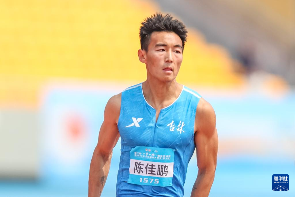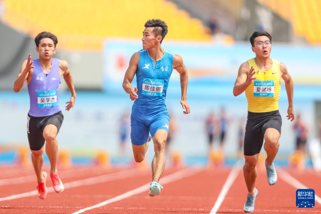 5月14日,吉林队选手陈佳鹏(中)在比赛中。最终,他以10秒37的成绩晋级复赛。
