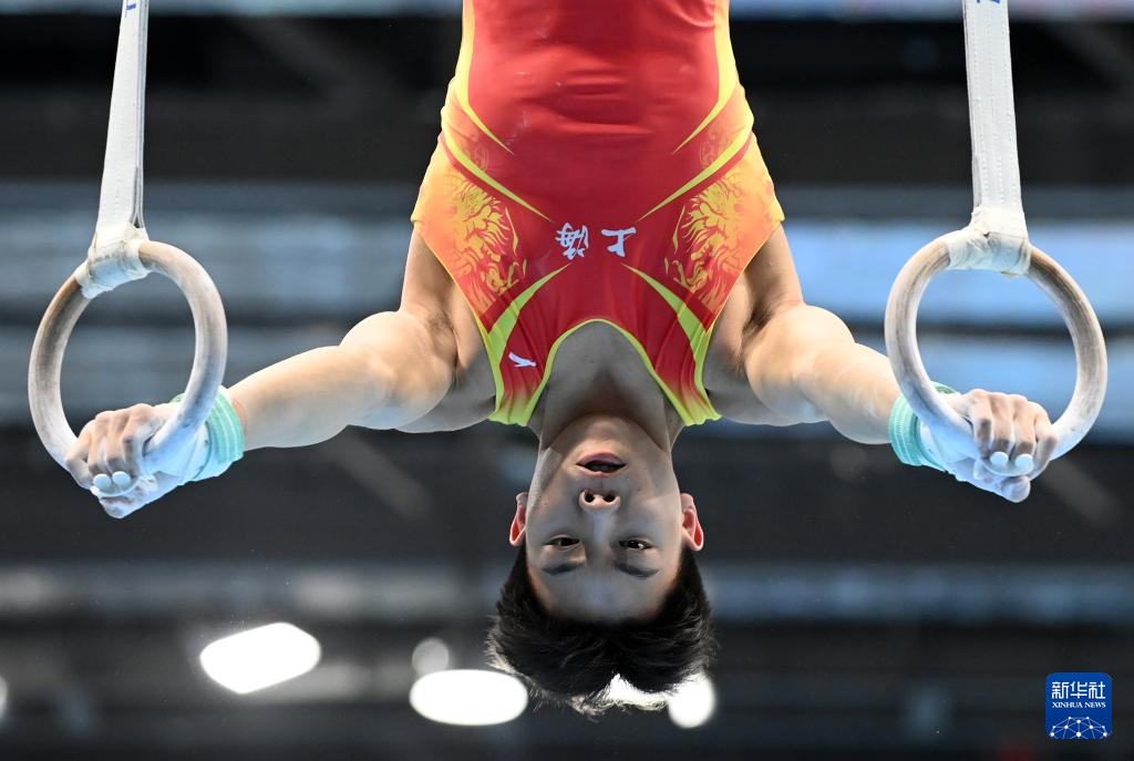 5月15日,上海队选手郑奥在男子预赛吊环比赛中。
