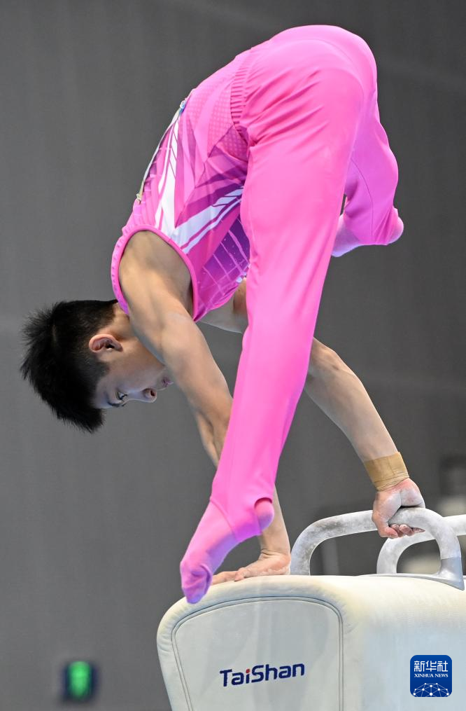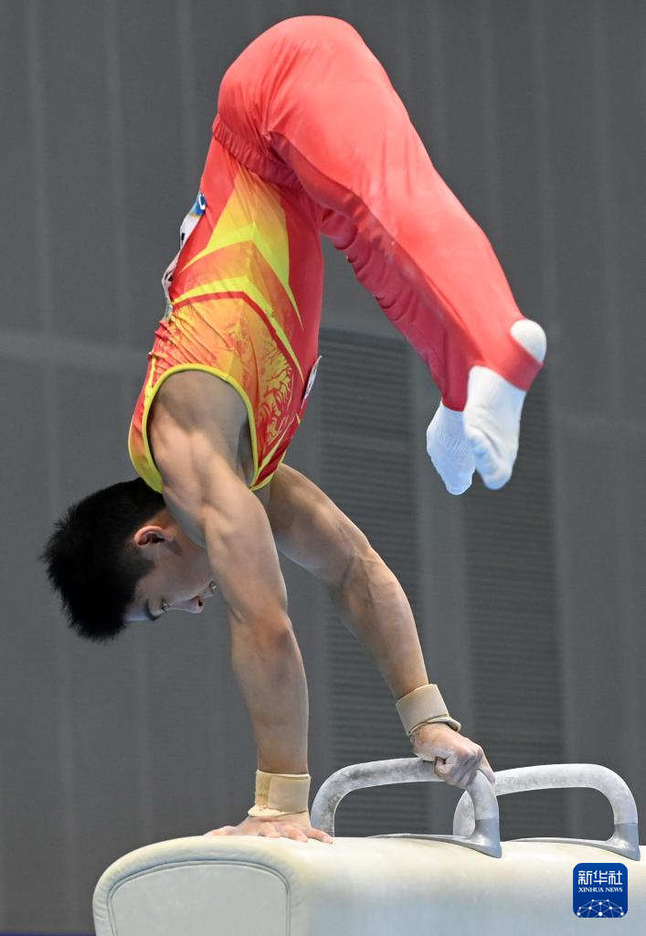 5月15日,湖北队选手李博文在男子预赛鞍马比赛中。