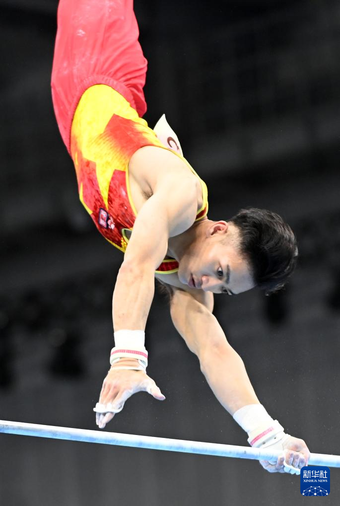 5月15日,湖南队选手李于毅在男子预赛双杠比赛中。