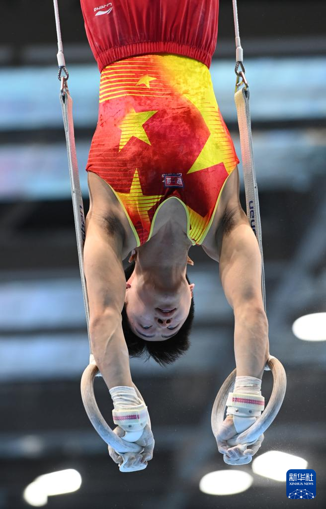 5月15日,贵州队选手陈宇在男子预赛吊环比赛中。