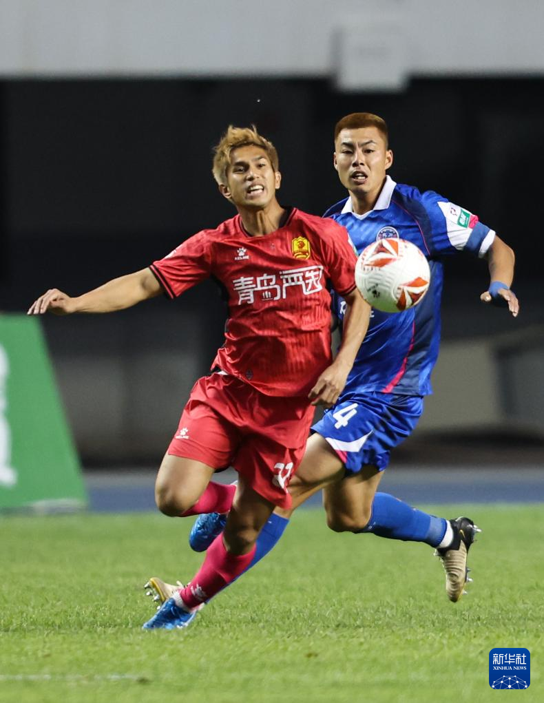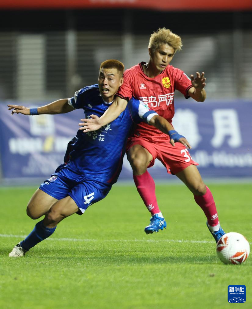 5月17日,石家庄功夫队球员潘奎(左)与青岛红狮队球员陈浩玮在比赛中拼抢。