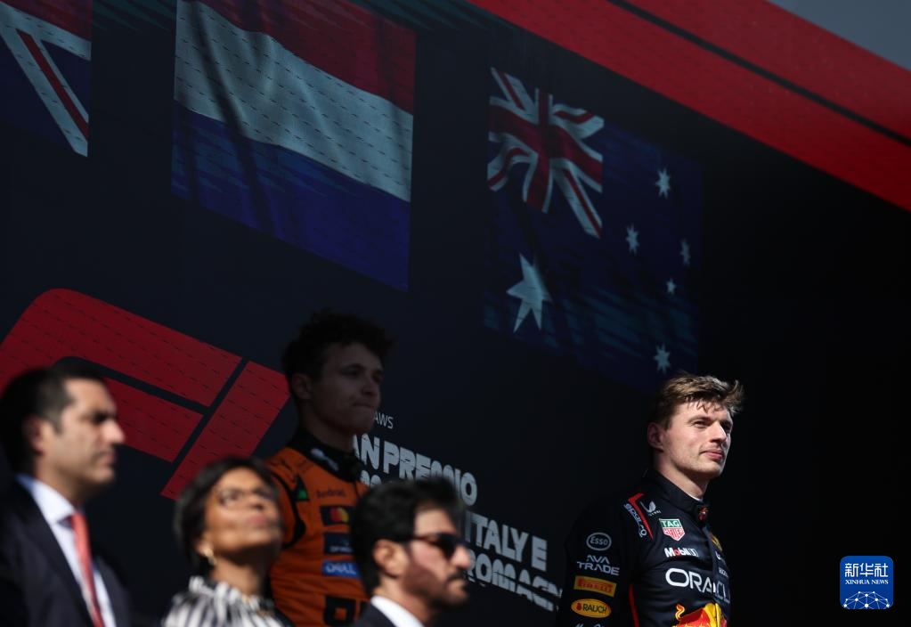 5月18日,冠军红牛车队荷兰车手维斯塔潘(左二)、亚军迈凯伦车队英国车手诺里斯(左一)和季军迈凯伦车队澳大利亚车手皮亚斯特里(右一)在颁奖仪式上合影。