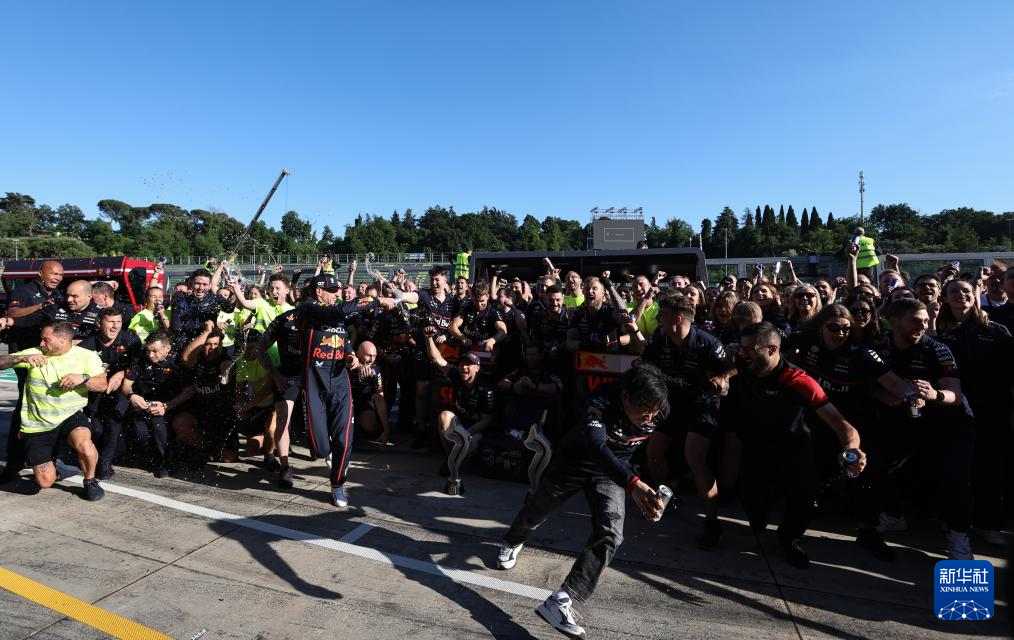 5月18日,冠军红牛车队荷兰车手维斯塔潘(中)和队友日本车手角田裕毅(前)与团队庆祝胜利。