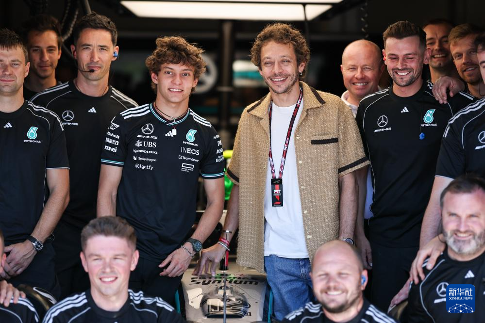 5月18日,梅赛德斯车队意大利车手安东内利(左四)在赛前与意大利退役职业摩托车赛车手瓦伦蒂诺·罗西(左五)合影。