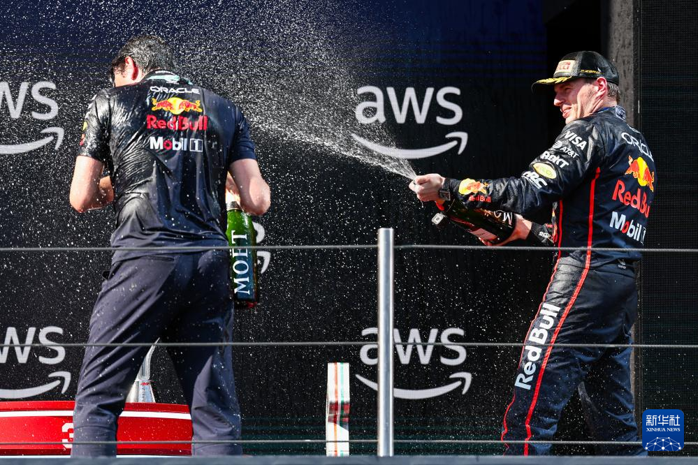 5月18日,冠军红牛车队荷兰车手维斯塔潘(右)在颁奖仪式上喷香槟庆祝胜利。