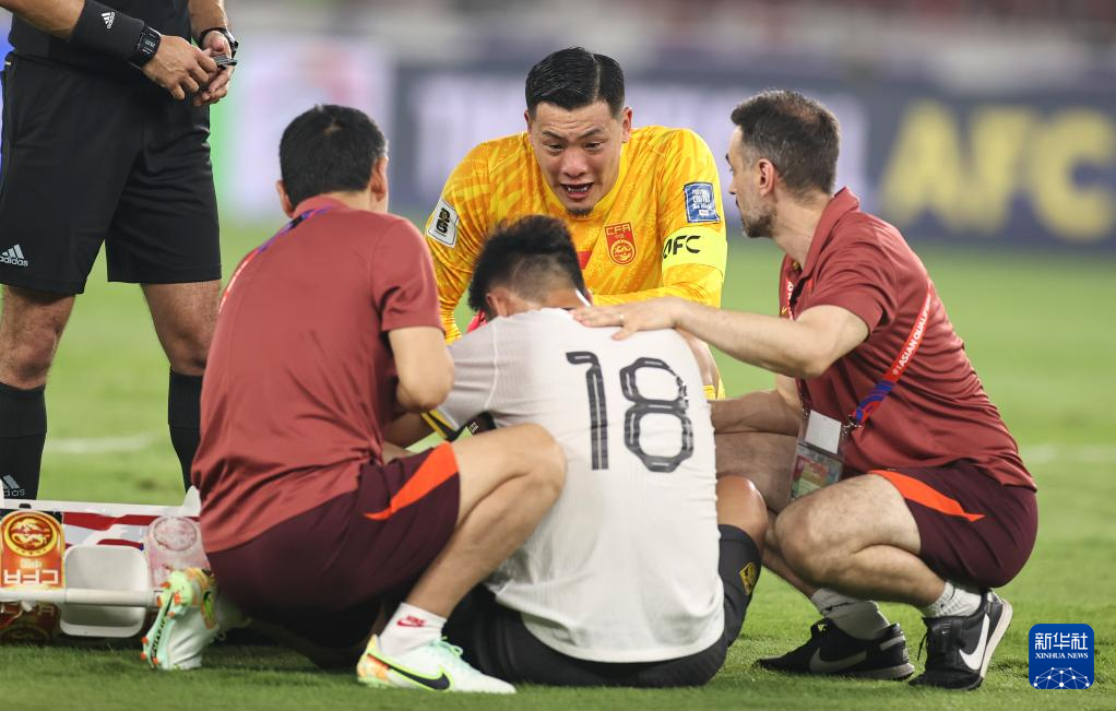 6月5日,中国队球员守门员王大雷(中上)询问队友韩鹏飞(中下)的伤情。
