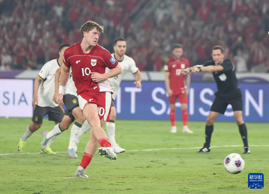 6月5日,印度尼西亚队球员罗梅尼(前)在比赛中主罚点球破门。