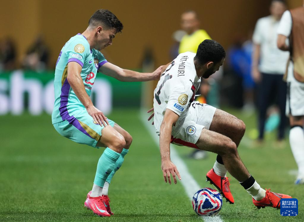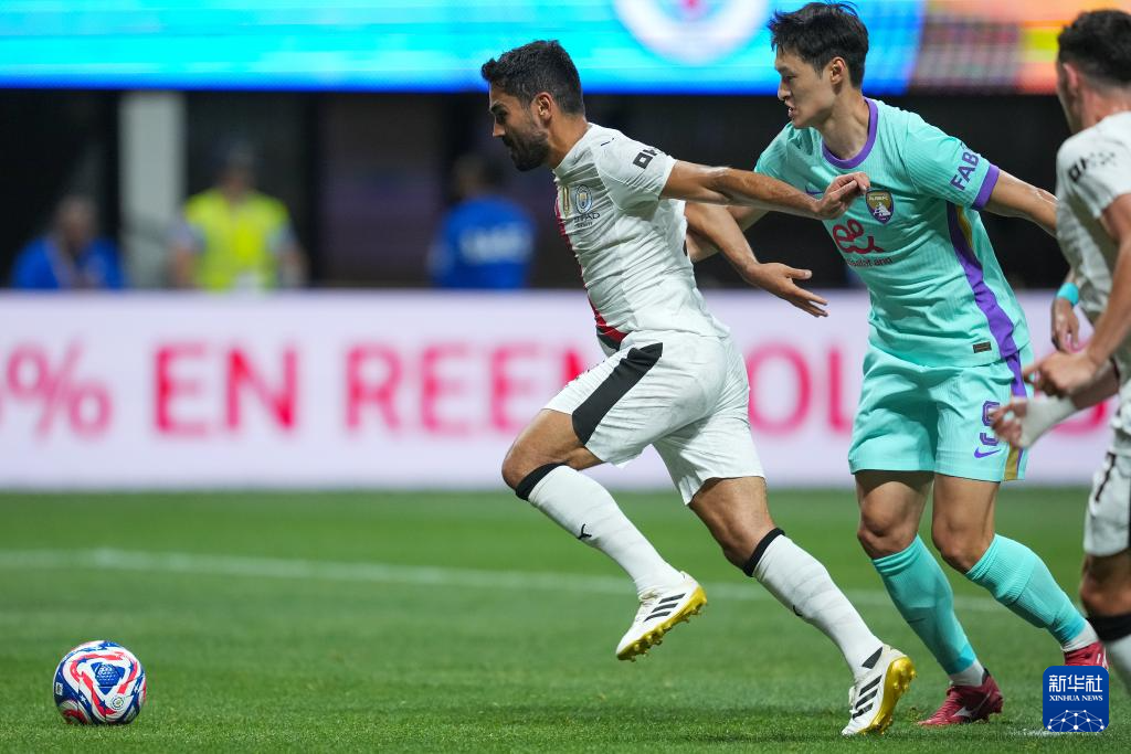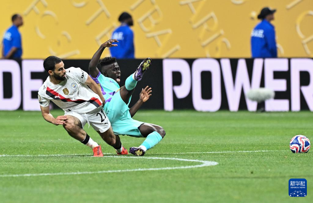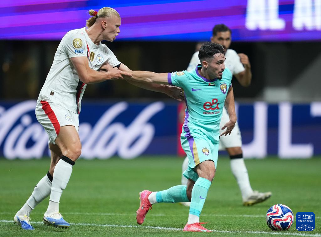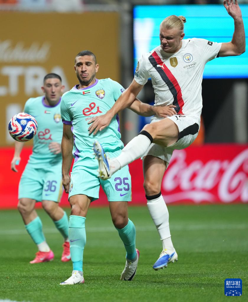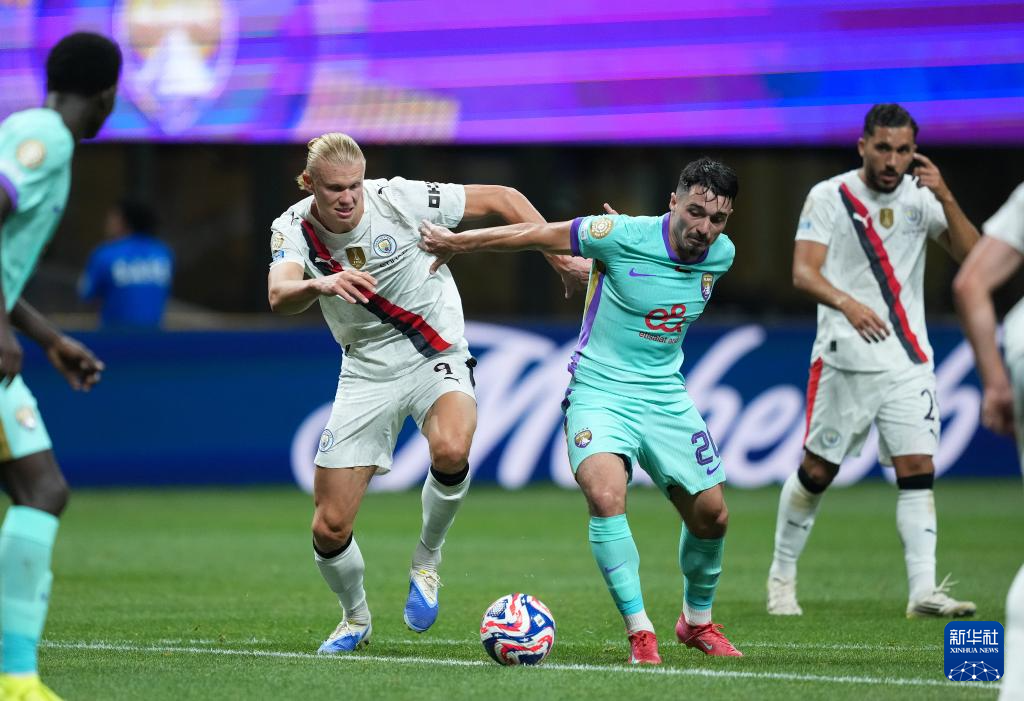 6月22日,曼城队球员哈兰德(左)和艾因队球员帕拉西奥斯在比赛中拼抢。