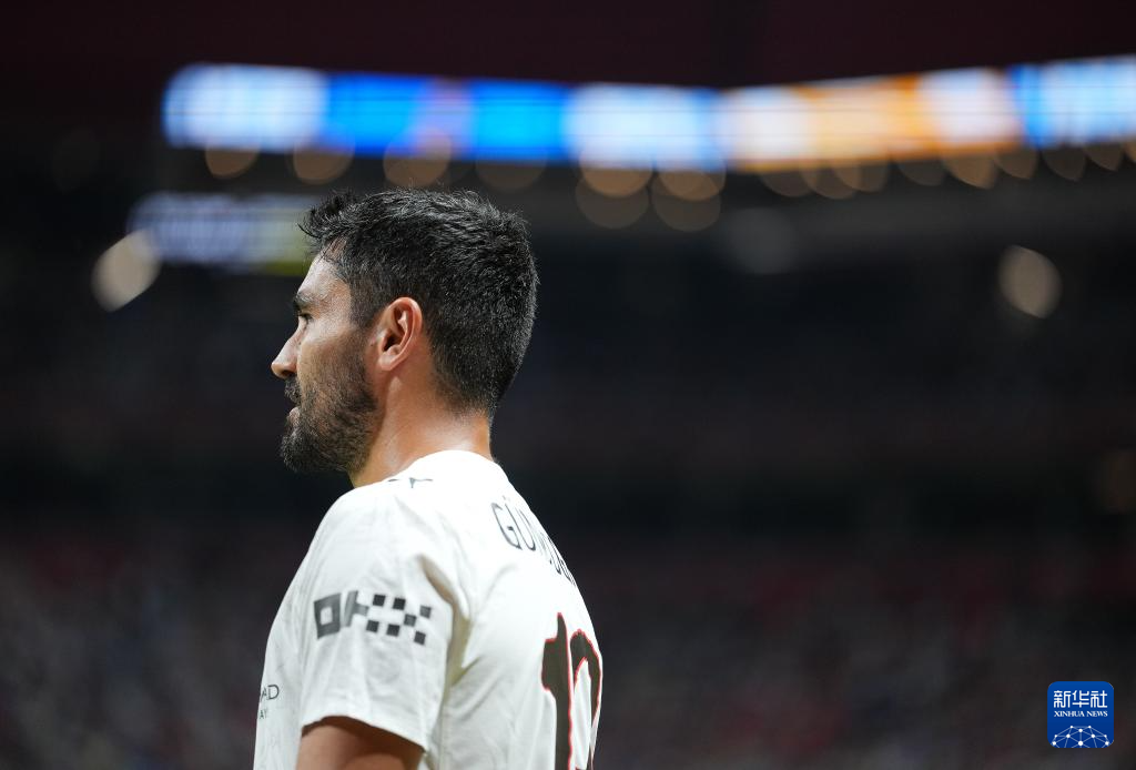 6月22日,曼城队球员京多安(前右)在比赛中射门得分。
