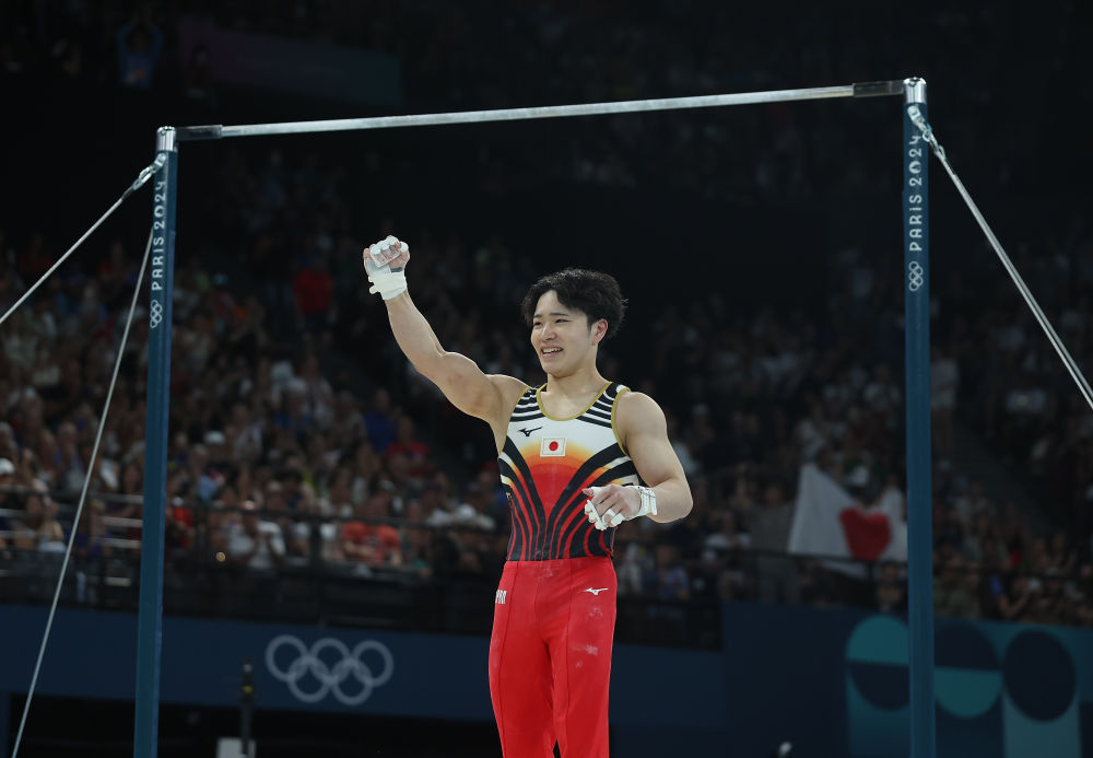 2024年8月5日,冠军日本选手冈慎之助在比赛后庆祝。当日,巴黎奥运会体操项目男子单杠决赛在贝尔西体育馆举行。新华社记者 曹灿 摄