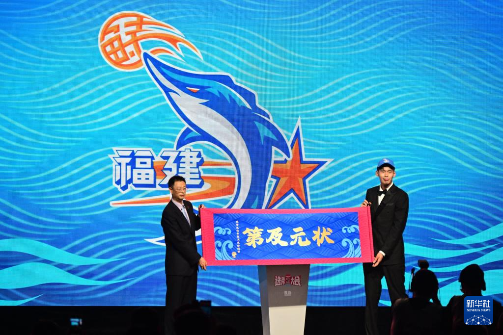 7月26日,来自清华大学的杨曦皓(右)在选秀大会上展示“状元及第”横幅。他在第一顺位被福建浔兴俱乐部选中。