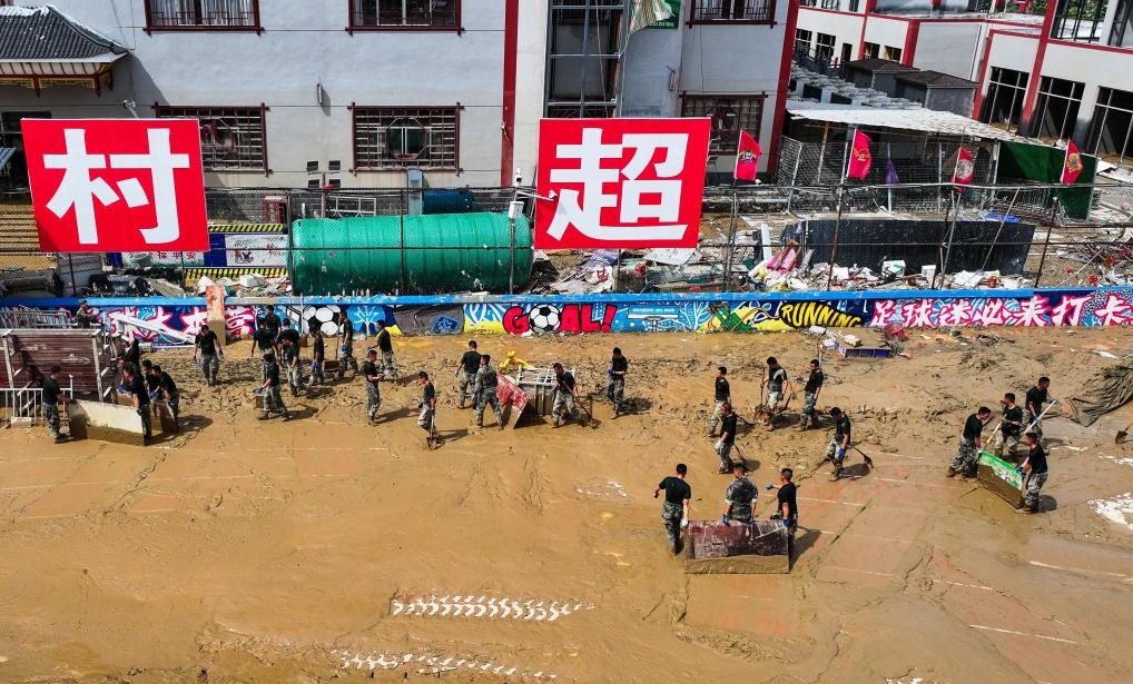 “村超”各村球队队员和啦啦队员,或在后方参与盒饭制作、搬运物资,或奔赴一线清淤清障、重建家园。