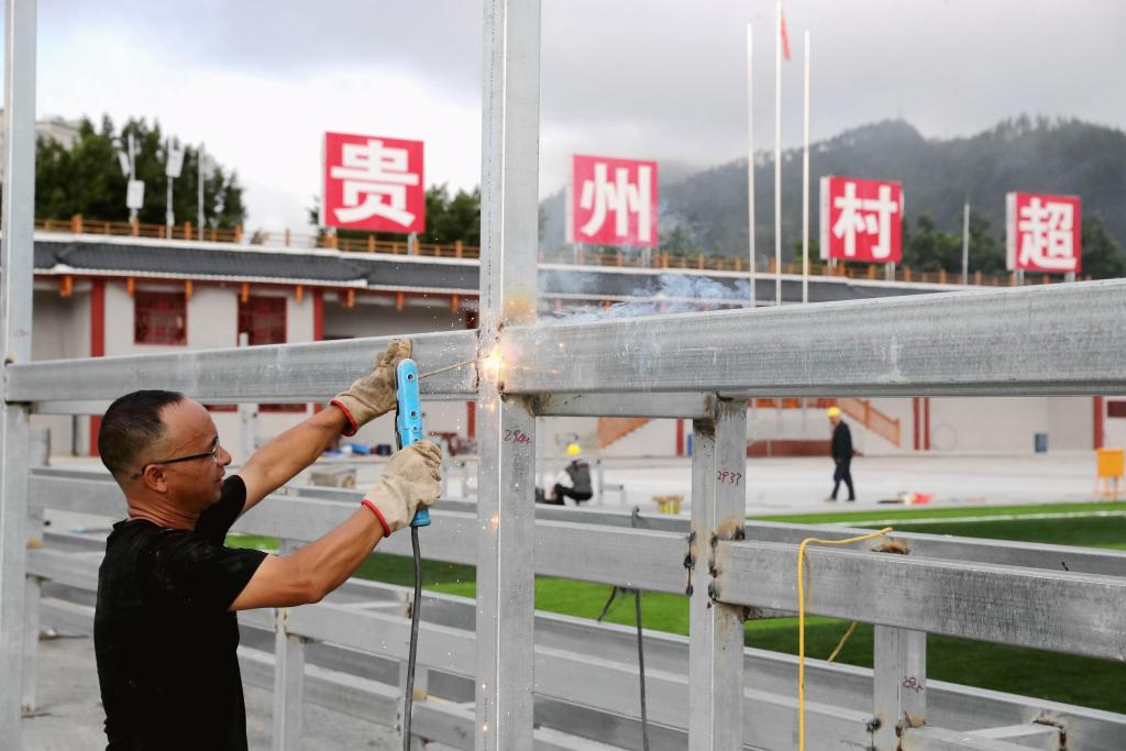 ↑7月15日,工人在贵州“村超”球场焊接观众席位钢架。新华社发(李长华 摄)
