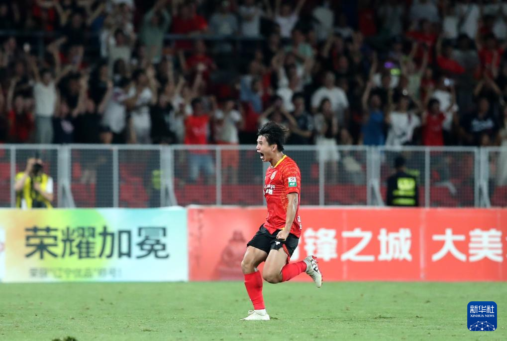 8月2日,广东广州豹队球员若昂·卡洛斯(左)在进球后庆祝。