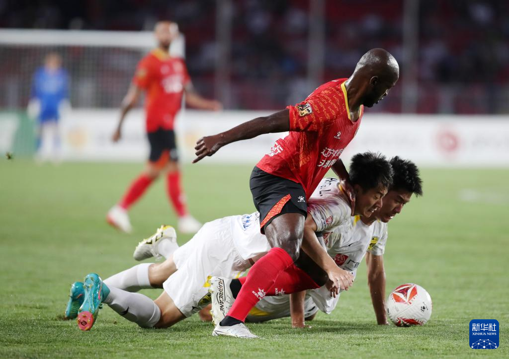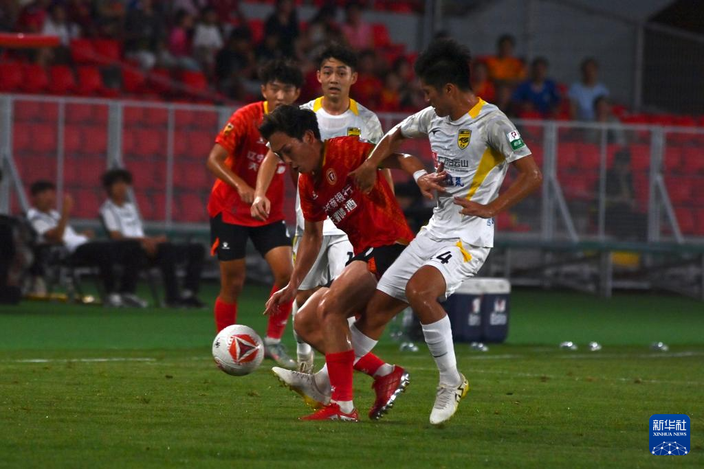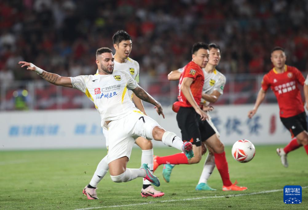 8月2日,广东广州豹队球员若昂·卡洛斯(左一)在比赛中射门。